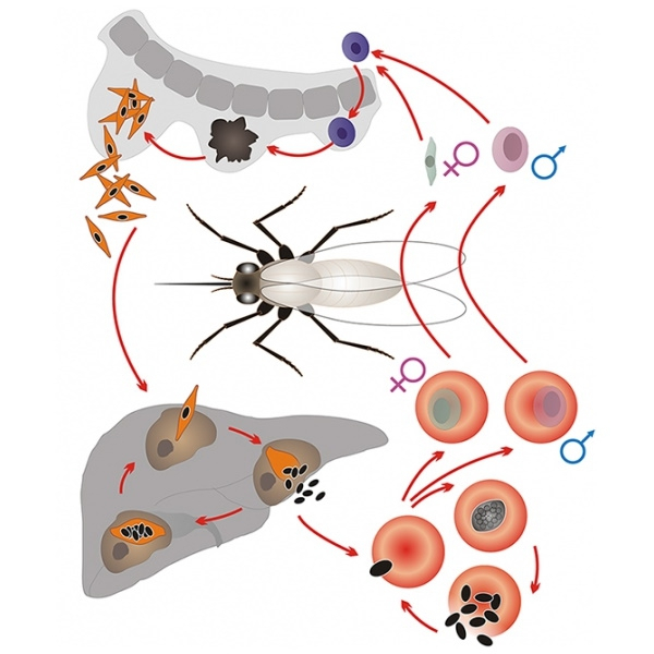 Плазмодии (Plasmodium) – род паразитических простейших подотряда гемоспоридий. Возбудители малярии позвоночных животных и человека. Переносчиками являются насекомые, главным образом малярийные комары – анофелесы. В организм человека при укусе комара попадают спорозоиты, внедряются в клетки паренхимы печени и вырастают в шизонтов. Последние размножаются путем шизогонии, образуя множество мерозоитов, которые внедряются в эритроциты, где многократно происходит цикл бесполого размножения (шизогонии). Эритроциты при этом разрушаются. После нескольких бесполых поколений в эритроцитах формируются гамонты. При кровососании они попадают в кишечный тракт комара, где формируют микро- и макрогаметы. При их копуляции формируются подвижные зиготы – оокинеты, которые проникают в стенку желудка и превращаются в ооцисты. В ооцисте образуются множество спорозоитов, которые попадают в слюнные железы комара. Таким образом, цикл замыкается.