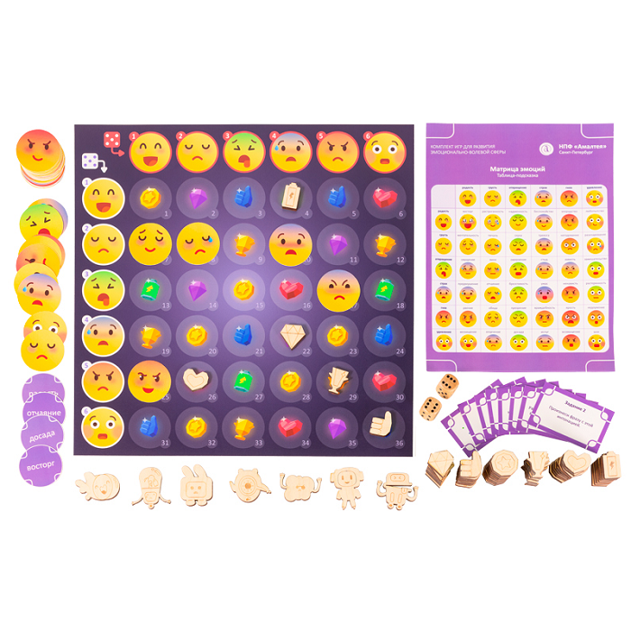 Специально разработанный наглядно-методический стимульный материал для развития эмоционально-волевой сферы представлен комплектом из четырёх настольных игр: Конструктор эмоций, Матрица эмоций. Театр эмоций, Куклы-Эмпатики.