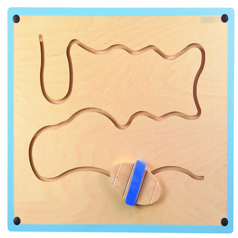 Деревянная панель "волна" (60х50х1,5 см) располагается на удобной высоте на стене. Ребенок надевает специальное "сабо" и проводит ногой от начала до конца извилистого желоба.