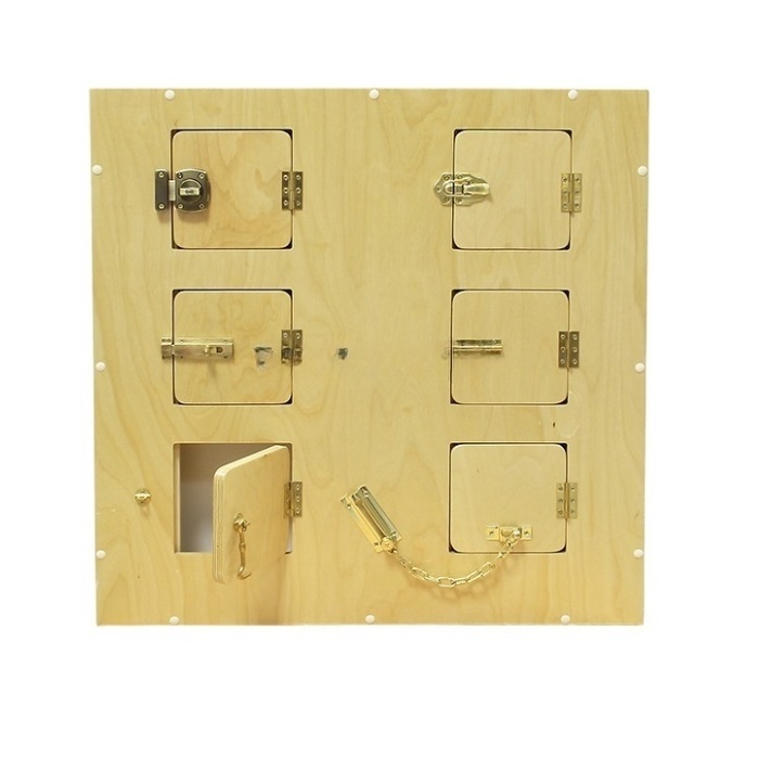 Главная Каталог Подготовительная группа и детский сад Монтессори Модульное оборудование Настенный модyль с 6-ю замочками и задвижками 70 *10 *70 см